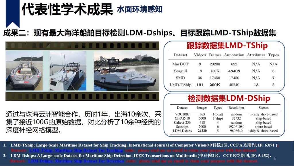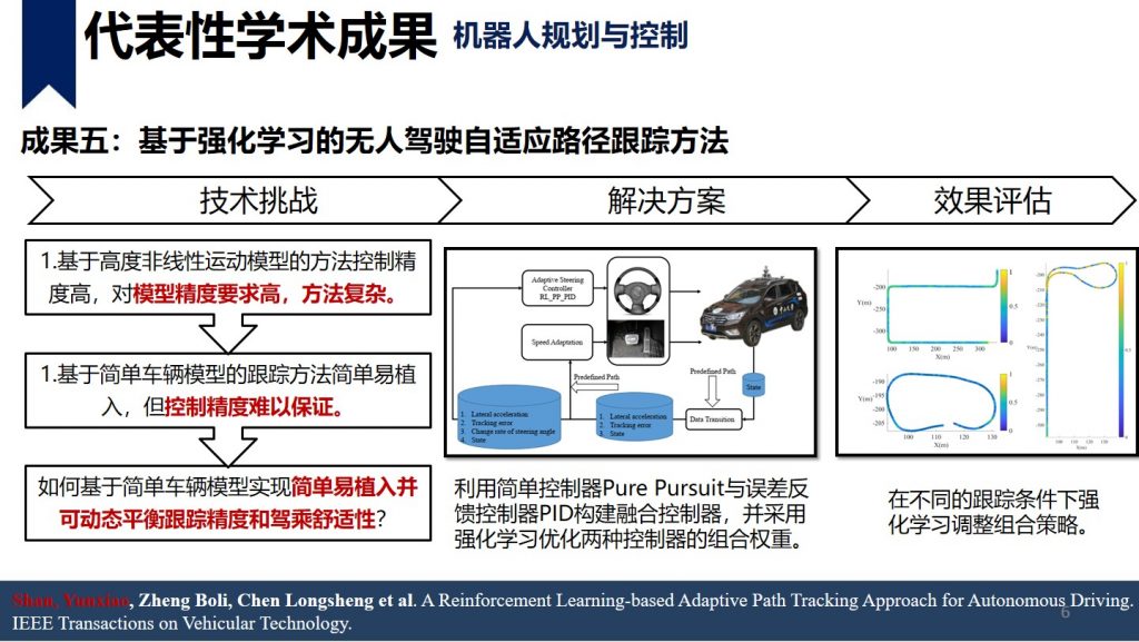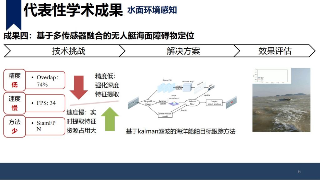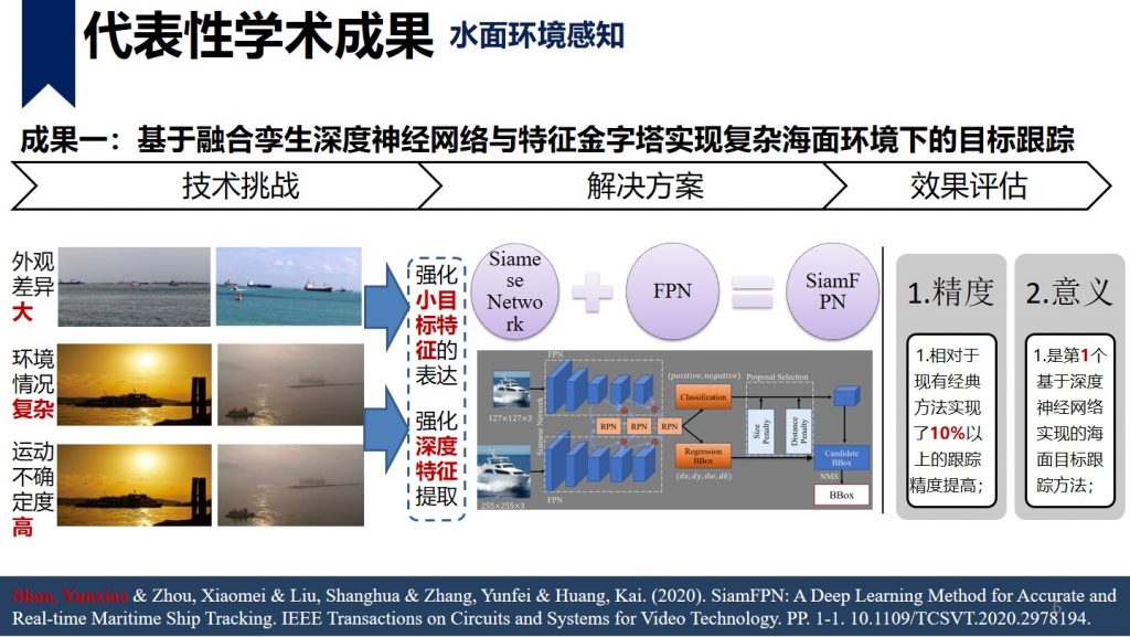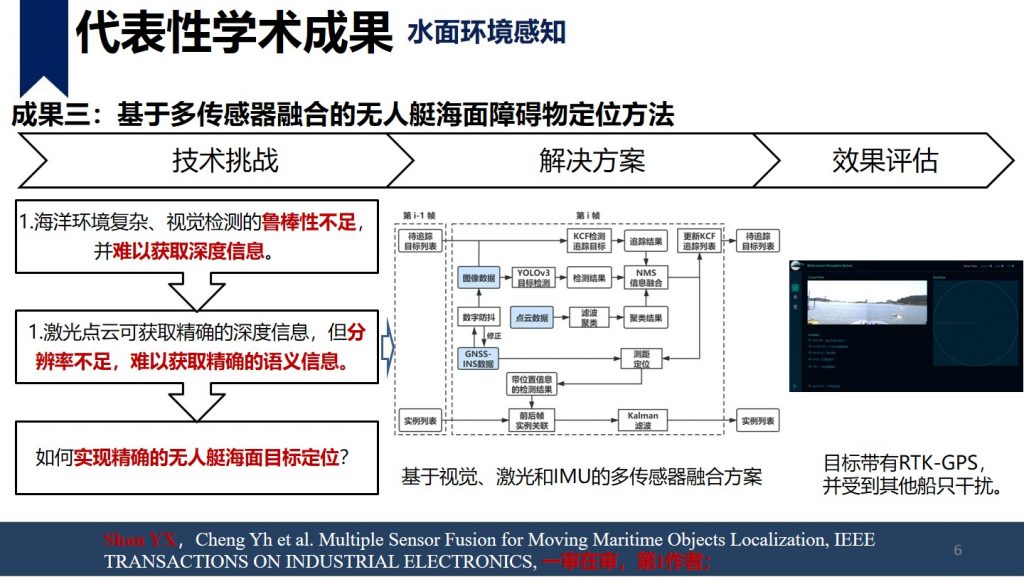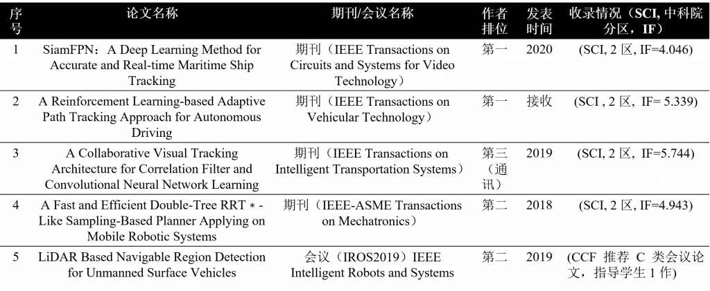 单云霄,美国罗格斯大学-武汉大学博士,中山大学人工智能学院副教授,第二届中国无人船公开赛评审专家,负责中山大学无人艇相关技术研究工作,专注于无人系统的规划控制技术以及基于单/多水面机器人的水面目标探测和跟踪、水面可通行区域提取等研究领域。目前项目组经费充足,欢迎对机器人算法、嵌入式、硬件系统等感兴趣的同学与我联系。本人比较push,喜欢勤奋真心愿意做事的小伙伴加入团队。 单云霄 副教授shanyx@mail.sysu.edu.cn个人主页 学术成就:博士研究主要专注于无人驾驶的规划与控制技术,博后的研究拓展到水面航行机器人、移动机器人等平台的感知、规划以及控制技术。在机器人的感知、规划、控制方向进行了深入的研究工作,在 ITS, TCVST, TVT等国际著名期刊发表学术论文 17篇, SCI 检索 6 篇(中科院 2 区以上论文 4 篇), EI 检索 11 篇(第一作者 4 篇),申请专利 10 件(第一发明人 4 件,授权 1 件)。 代表性学术成果: 主持参与科研项目: 1.基于智能海防多源感知互联预警的关键技术研究(深圳市科创委),200万,排名第二,2019-2021;2.高海况下远海多无人船自主循迹与协同关键技术研究及产业化应用示范(广东省重点研发),500万,项目编号:2018B010108004,中山大学子课题负责人,2019-2021;3.面向多场景的高精度全转向大载荷移动操作一体化机器人开发与应用示范(广东省重点研发),1000万,项目编号:2019B090919003,中山大学子课题负责人,2019-2021;4.基于视觉的机器人环境建模与定位导航(科技部重点研发),1000万,课题编号:2018YFB1305005,骨干成员,2019-2021; 1.基于深度学习的水面目标检测与跟踪 当前研究成果:开发了SiamFPN RPN算法,实现了高海况条件下目标跟踪效果相对于传统方法10%以上的精度提高。 跟踪模型准确率召回率F值KCF(2014)64.88%64.88%64.88%ECO(2016)65.09%65.09%65.09%SiamRPN(2017)58.04%57.39%57.71%SiamVGG(2018)56.27%55.88%56.07%SiamFPN RPN73.7%73.67%73.69% 未来研究方向:1.基于深度神经网络的多传感器融合的水面目标检测跟踪方法(包括但不限于:可见光、红外、激光雷达、毫米波雷达)2.基于多机器人系统的多水面目标的检测与跟踪方法 2.水面激光类的应用算法研究 当前研究成果:利用轻量化神经网络实现河岸目标分类,同时利用粒子滤波和凸多边形实现目标水面可行驶区域的提取。 未来研究方向: 1.利用激光雷达实现3Dslam定位,解决高动态水面对SLAM技术的影响,实现无人船在弱GPS情况下的自主定位。 2.利用激光雷达实现水面物体的准确感知,针对水面物体摆动大,外观差异大的特点,利用激光雷达或与其他传感器融合准确实现对水面物体的3D建模、定位、跟踪。 3.机器人的运动规划与控制技术 主要专注于无人驾驶汽车的规划与控制技术,目前在研的三个主要方向是考虑不确定性的运动规划技术、数据驱动规划方法以及端到端的转向控制方法研究。其中不确定的运动规划技术研究方向欢迎有数学背景或对优化控制感兴趣的小伙伴与我联系。 控制技术方向主要专注于基于强化学习的路径跟踪控制以及自适应跟踪控制方法。